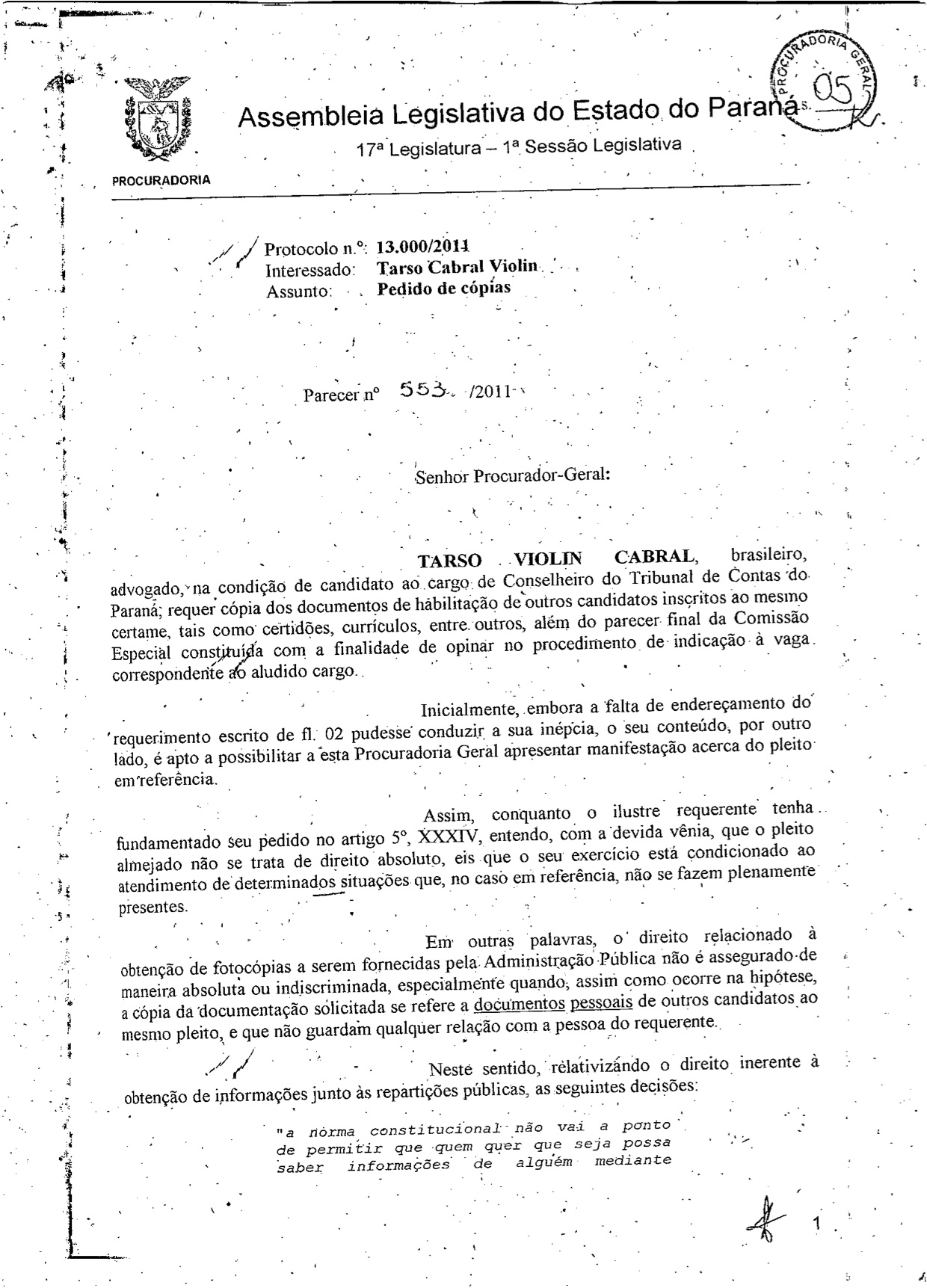 Hoje durante meu discurso na Assembleia Legislativa do Paraná, sobre a candidatura para Conselheiro do Tribunal de Contas, eu informei que um dos pedidos da minha Ação Popular contra a Assembleia e contra o Deputado Rossoni foi devido ao meu requerimento de cópias dos documentos de habilitação do Procurador-Geral do Estado, Ivan Lelis Bonilha, e dos Deputados Estaduais Nelson Garcia e Augustinho Zucchi, também candidatos, além dos demais documentos e pareceres relativos às impugnações, que foram negados pela Assembleia.