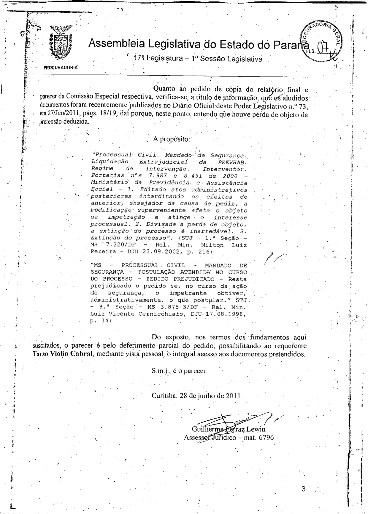 O Assessor Jurídico da Assembleia, Dr. Guilherme Ferraz Lewin, fez parecer no sentido de que o direito de petição e certidão do art. 5º, inc. XXXIV, da Constituição, NÃO É ABSOLUTO. Parecer ratificado pelo Procurador do Estado e Procurador-Geral da Assembleia Legislativa, Luiz Carlos Caldas.
