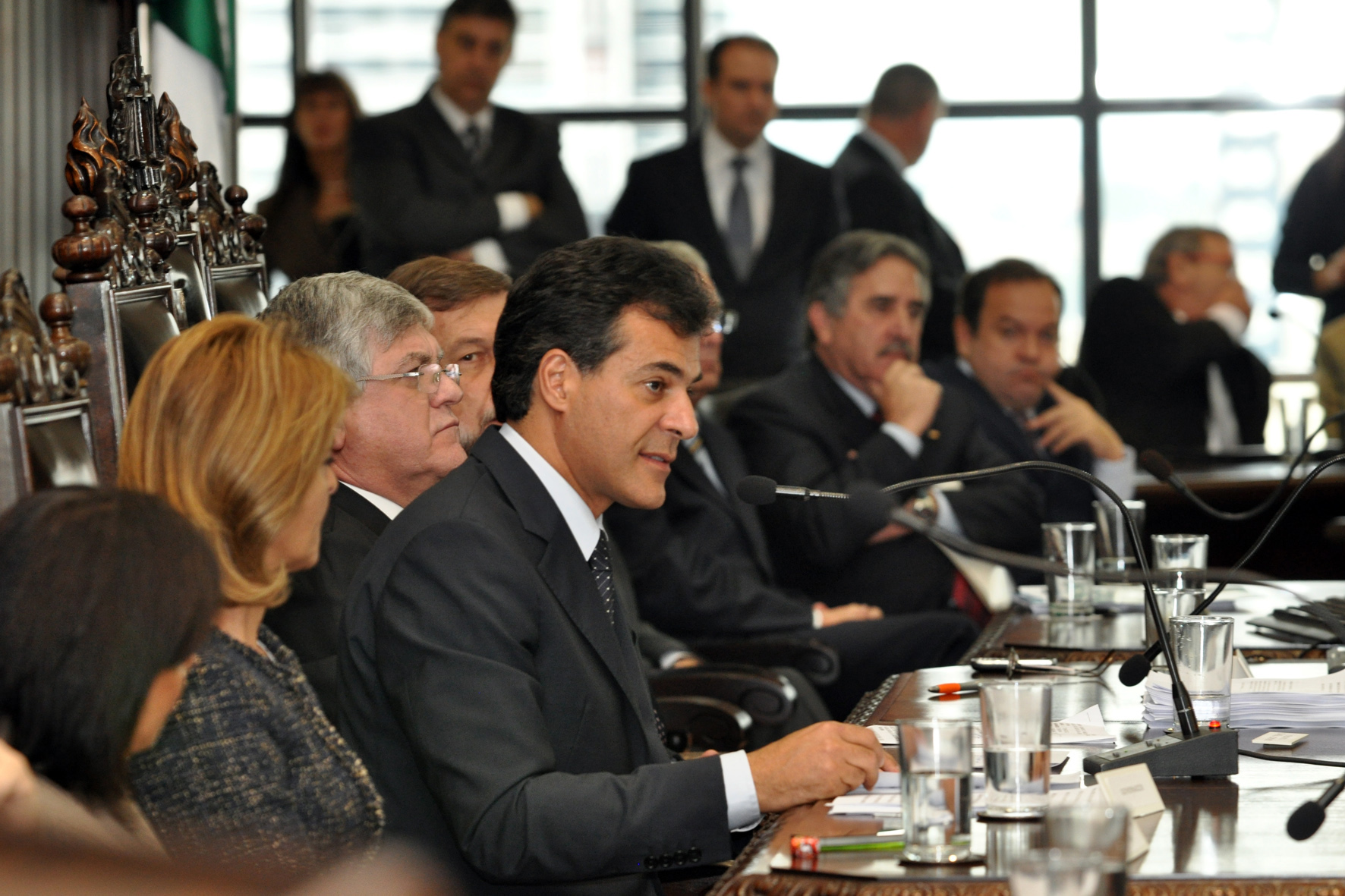 Governador Beto Richa discursando sobre como é bom privatizar. Ao fundo o presidente da OAB/PR, José Lúcio Glomb. Foto:Rogério Machado/SEDS