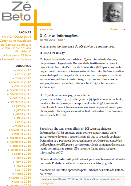 Em “nota à imprensa” divulgada pelo Blog do Zé Beto (se é que se pode chamar de imprensa um blog de baixa qualidade e credibilidade), o ICI – Instituto Curitiba de Informática, entidade privada qualificada como Organização Social – OS, que recebe milhões de reais e utiliza bens e servidores públicos para prestar serviços de informática para a prefeitura de Curitiba, sem ter participado de licitação, divulgou uma nota patética sobre a minha saga para conseguir informações de interesse público junto ao ICI, noticiada durante a semana devido à vigência da Lei de Acesso a Informação.
