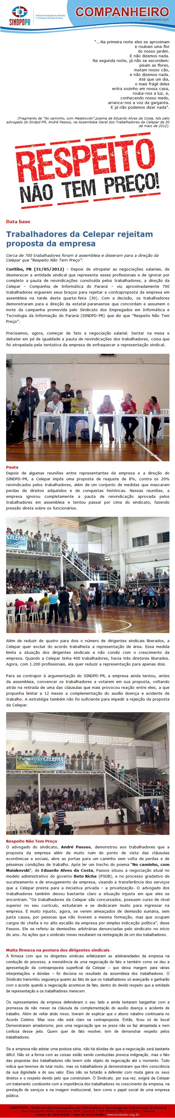 Curitiba, PR (31/05/2012) – Depois de atropelar as negociações salariais, de desmerecer a entidade sindical que representa esses profissionais e de ignorar por completo a pauta de reivindicações construída pelos trabalhadores, a direção da Celepar – Companhia de Informática do Paraná – viu aproximadamente 700 trabalhadores erguerem seus braços para rejeitar a contraproposta da empresa em assembleia na tarde desta quarta-feira (30).