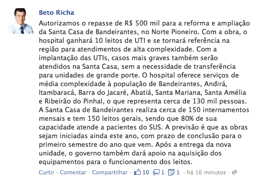 O governador Beto Richa (PSDB) acabou de anunciar no seu Facebook, todo orgulhoso, que irá repassar R$ 500 mil para a reforma e ampliação da Santa Casa de Bandeirantes, no Norte Pioneiro. O hospital atende apenas 80% de pacientes do SUS – Sistema Único de Saúde. Os demais 20% o hospital cobra dos cidadãos ou são planos de saúde privados.