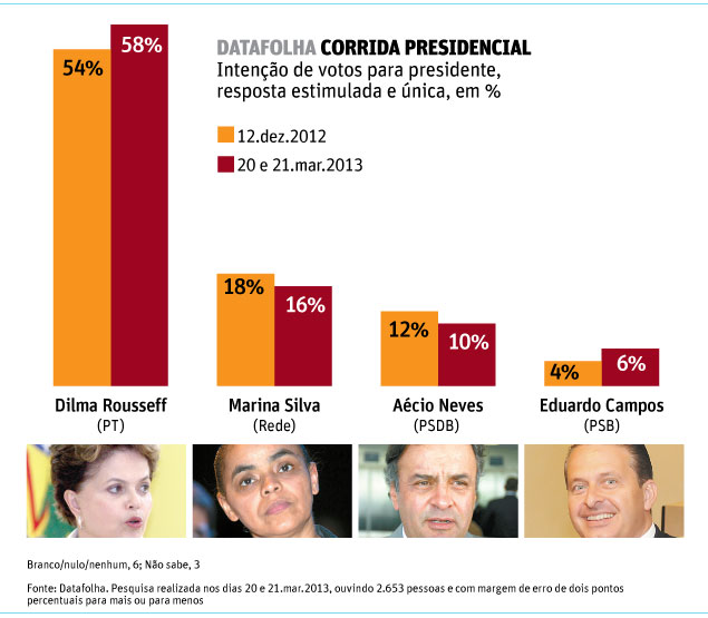 Segundo o Datafolha, se a eleição presidencial que ocorrerá em 2014 fosse hoje, a presidenta Dilma Rousseff (PT) seria reeleita com 58% dos votos (subiu 4 pontos), a ex-senadora e ministra petista, Marina Silva (Rede), caiu 2 pontos e teria 16%, o tucano Aécio Neves (PSDB) caiu 2 pontos e teria 10% e o governador de Pernambuco, Eduardo Campos (PSB), mesmo com toda a propaganda da velha mídia nas últimas semanas, subiu apenas 2 pontos e tem ínfimo 6%. Nulos e brancos: 6% e 3% não sabem.