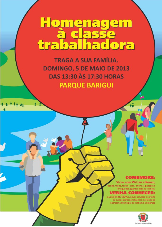 Domingo, 5 de maio de 2013, das 13h30 às 17h30 no Parque Barigui, com shows e atividades. Evento organizado pela vice-prefeita e secretária municipal do Trabalho e Emprego, Mirian Gonçalves (PT), e sua equipe.