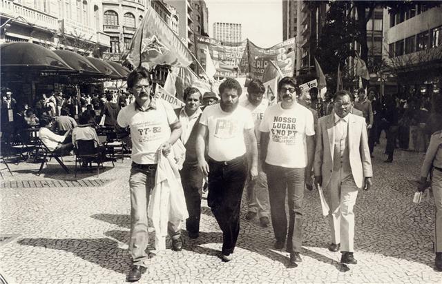 Vitório Sorotiuk, o falecido Pedro Chaves (de chapéu), Lula, Ivo Pugnaloni, Edésio Passos, Jairo Graminho e Manoel Izaías de Santana, também falecido, na caminhada pela Boca Maldita em 1982