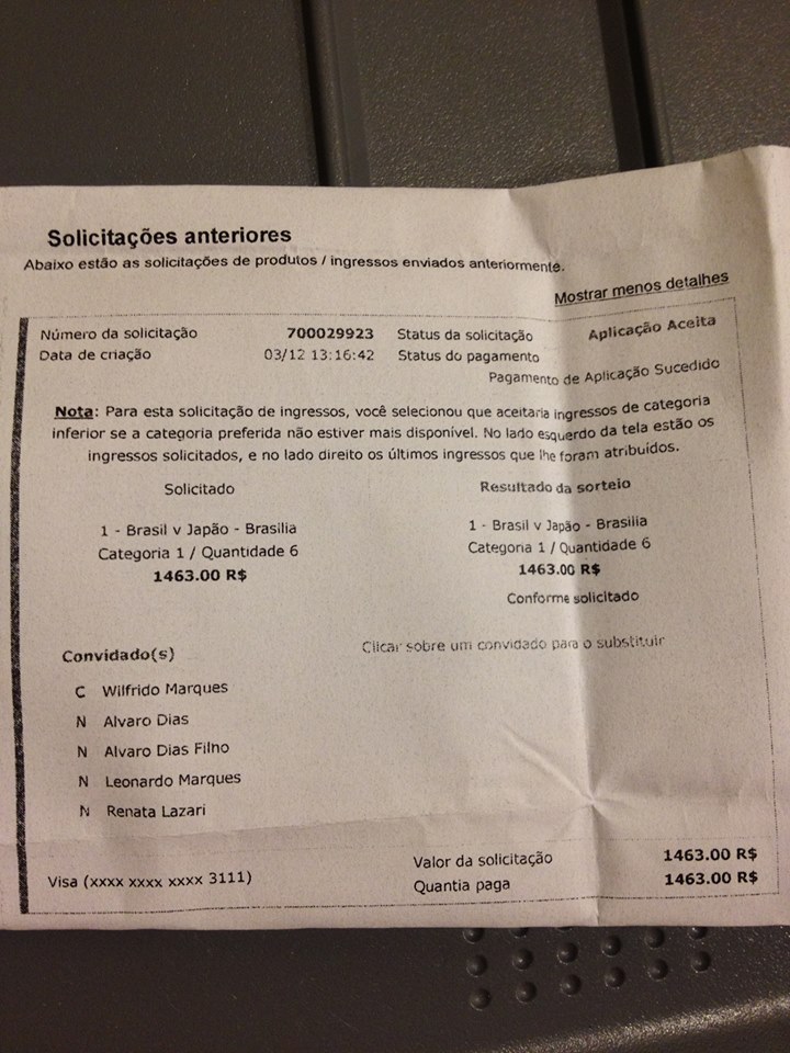 Conforme fotos divulgadas no próprio Facebook do senador Alvaro Dias (PSDB/PR), ele gastou R$ 1.463,00 por seis ingressos para assistir o jogo do Brasil e Japão. O povo longe do estádio. Quem vaiou a presidenta? Veja o post: Elite vaiou Dilma.