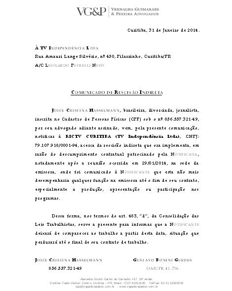 Em respeito aos meus leitores, ouvintes e telespectadores, amigos, fontes, enfim, a todos que acompanham meu trabalho, comunico, oficialmente, que não tenho mais qualquer ligação com a RICTV Record. Através de um documento, enviado por cartório (veja abaixo) comuniquei o rompimento do contrato com a emissora. Eu vou explicar um pouco do bastidor dessa história. Assim que retornei de férias, em meados de janeiro, fui chamada para uma reunião com o então presidente da RIC no Paraná, Leonardo Petrelli. Ele, com todas as letras, me disse que nesse ano “especial” a RICTV Record havia optado por um outro tipo de jornalismo, mais “tranquilo”, ou seja, menos combativo, menos investigativo e que eu, nas palavras dele, era forte demais. Claro que eu, como colunista forte e independente nunca me encaixaria nesse tipo de jornalismo. Por tais razões fui afastada do ar, mesmo com meu contrato ainda em vigência. Perguntei claramente qual foi o acordo com a tropa de choque da política nativa já denunciada por essa colunista e que frequentemente tentava me pressionar através dos gestores pelo meu trabalho não só na TV como no meu blog e questionei quais denúncias influenciaram tal decisão “editorial” e disse ao presidente da RICTV Record algo que eu vivo diariamente e que move meu trabalho e minha postura profissional: “Eu sou águia e águia jamais será pato”.