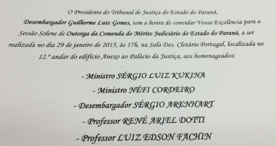 O Tribunal de Justiça do Paraná outorgará a Comenda do Mérito Judiciário do Estado, no dia 29 de janeiro de 2015, 17h, para os grandes juristas paranaenses Luiz Edson Fachin (UFPR e PUCPR), René Ariel Dotti (UFPR), Ministros Néfi Cordeiro (foi meu professor na PUCPR) e Sérgio Luiz Kukina e Desembargador Sérgio Arenhart.