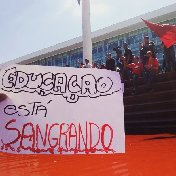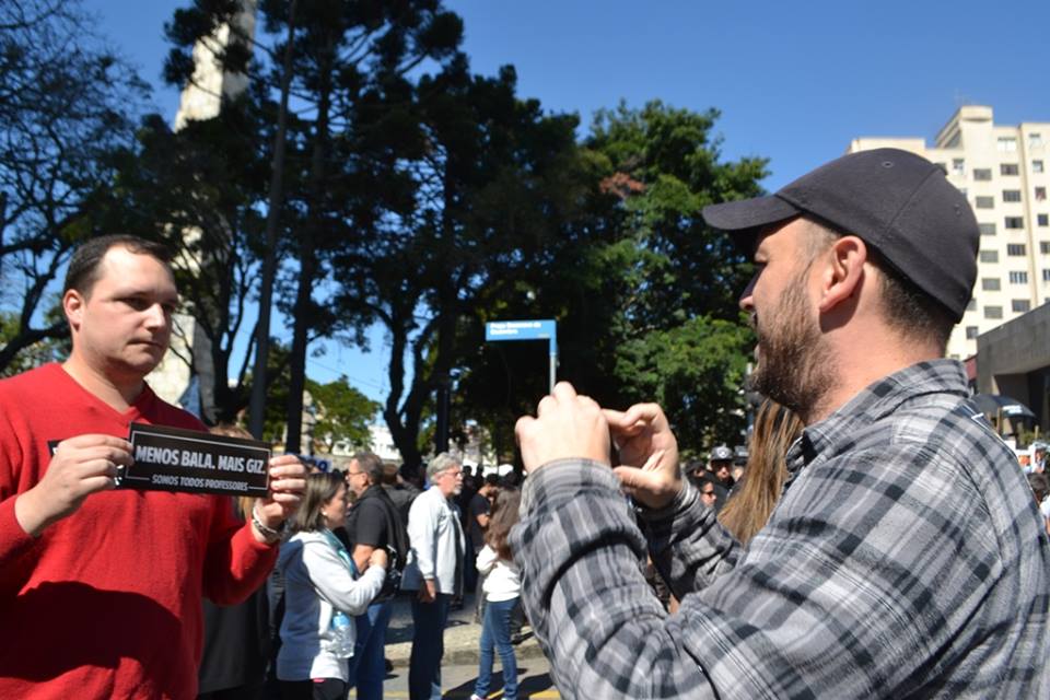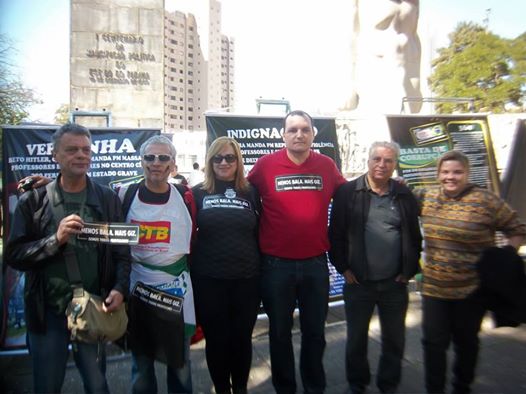 O lema, repetido nacionalmente, foi “menos bala, mais giz”, no dia do trabalho que no qual também foi ressaltada a Democratização da Mídia e a luta contra o PL 4330 das terceirizações de atividades-fim.