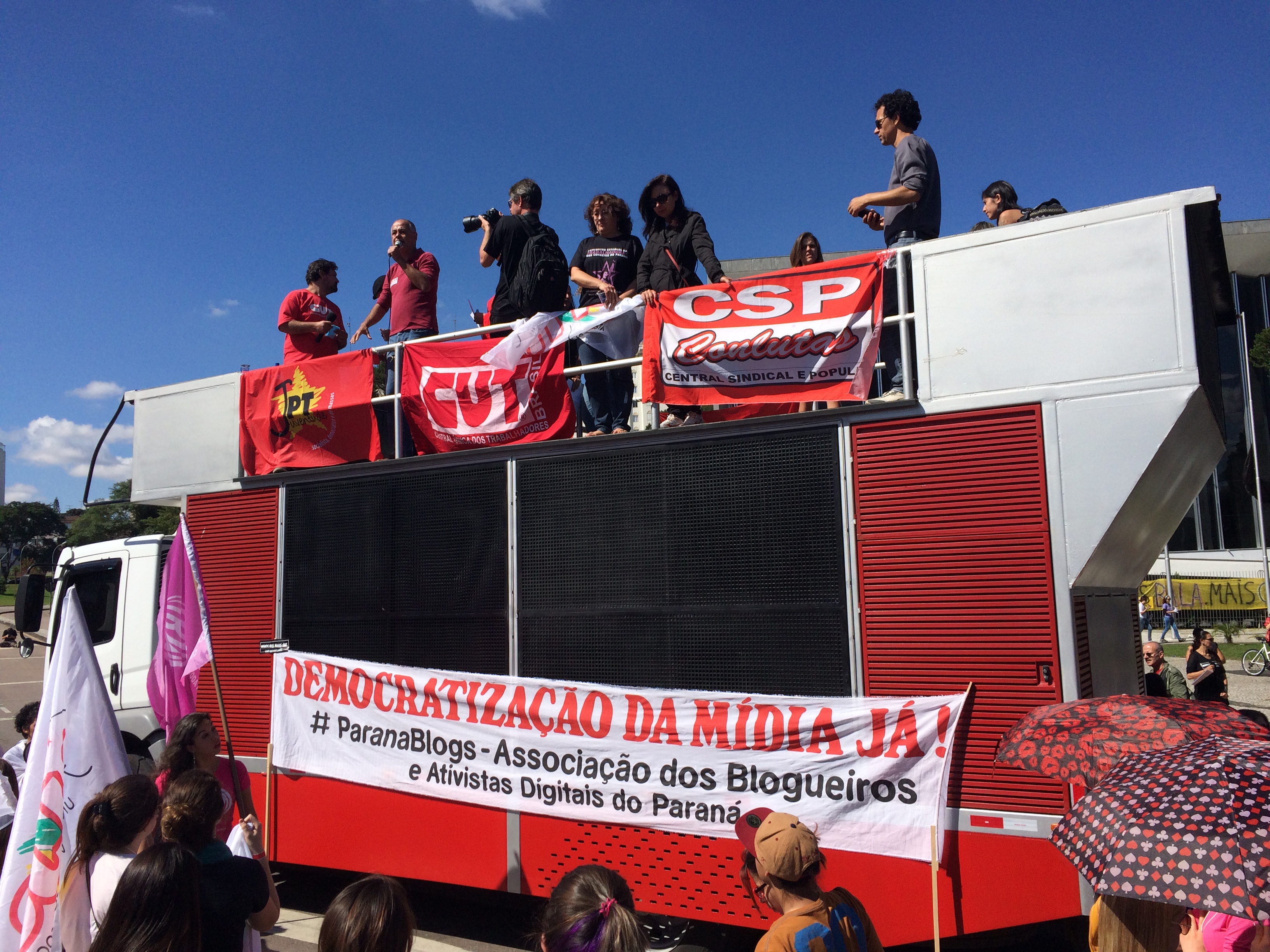 Zé Maria, presidente nacional do PSTU, discursa no caminhão de som com a faixa da Associação ParanáBlogs