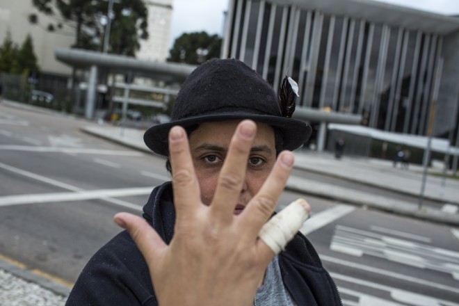 “No dia 29 pela manhã, eu já estava há quase dois dias sem dormir. Os helicópteros começaram a dar rasantes sobre o acampamento, levantando poeira e as barracas. Quando o caminhão de som avisou que estavam começando a votar o projeto do ParanaPrevidência houve muita confusão. Começou a vir pancada de tudo quanto é lado. Coloquei a mão no rosto e nisso veio um cassetete no meu braço, que acabou quebrando meu dedo. Por sorte tinha amarrado papelão como uma ‘armadura’ na perna. Mas não adiantou: senti muita dor e saí correndo. Quando cheguei no bosque da praça fiquei tentando apagar o fogo das bombas que caíam nas barracas. Os policiais corriam e parecia um videogame de guerra. Absurdo. Caí, inconsciente. Acordei perto de uma parede e só lembro de um menino de olhos verdes que estavam vermelhos de fumaça. Ele chorava e me arrastava. Mesmo machucada, fui ajudar outras pessoas no acampamento. Minha vida mudou muito depois disso. Eu ando com medo. Sinto cheiro de gás, de pólvora estourando. E com qualquer barulho eu fico pensando ‘meu Deus, é aqui? Não é?’. Fui três vezes no posto de saúde 24h do Boa Vista e fiquei quatro horas esperando. Meu dedo ficou uns cinco dias inchado até colocarem a tala. Sou do PSS, não tenho sistema de saúde e vou ter que ir num hospital particular. Não sei como vou pagar, porque ainda não recebi salário este ano. Ainda estou me recuperando dos fungos no pé do primeiro acampamento da greve, lá em fevereiro.”
