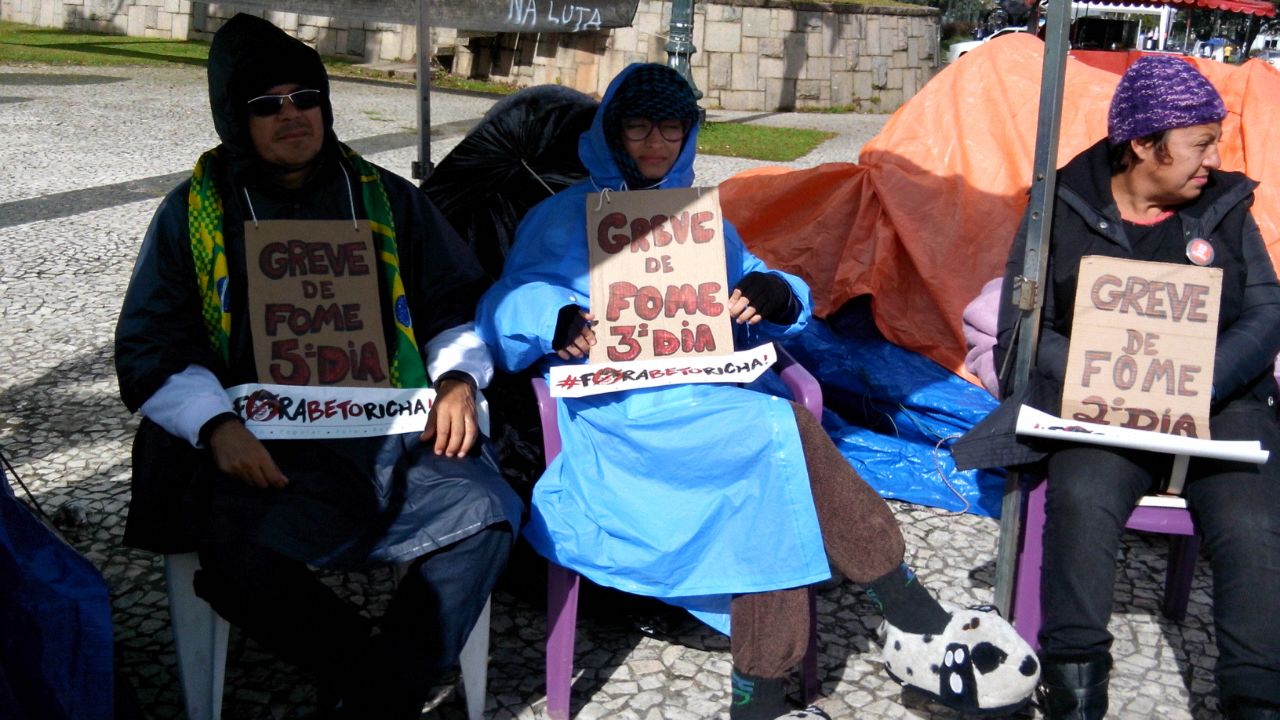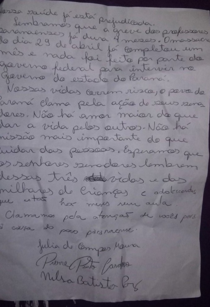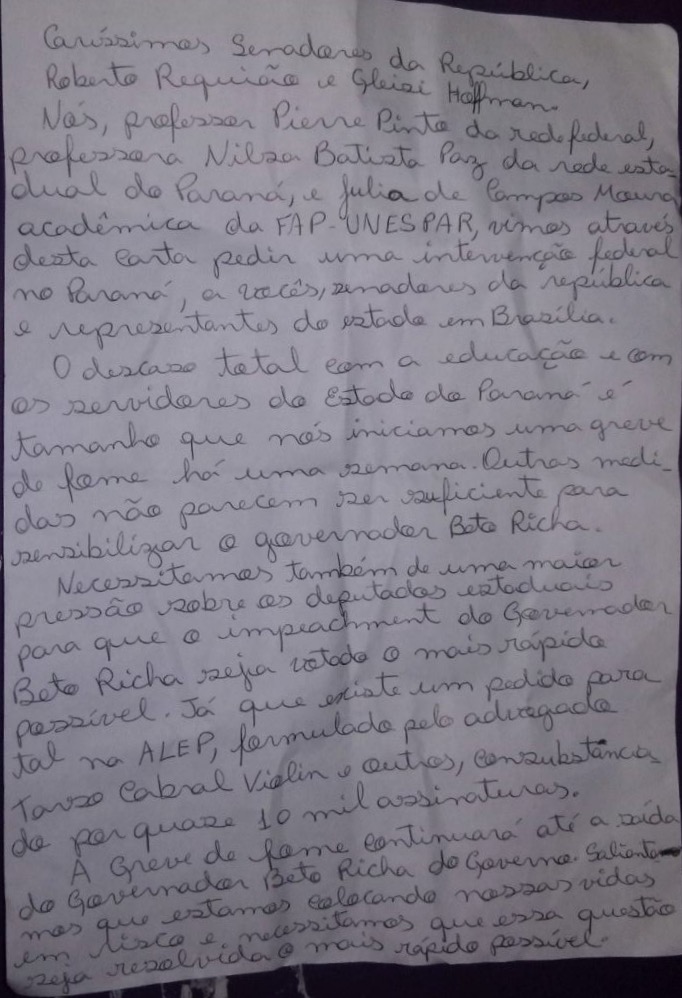 Os professores Pierre Cardoso Pinto (UTFPR) e Nilsa Barbosa da Paz e a estudante Júlia Campos (Unespar) pedem em carta para os senadores Roberto Requião (PMDB) e Gleisi Hoffmann (PT) que haja uma intervenção federal no Paraná. Informam que apenas vão parar a greve de fome se o governador Beto Richa (PSDB) sofrer o Impeachment pedido pelo advogado e professor universitário Tarso Cabral Violin (Blog do Tarso), pelos juristas e mais de 9 mil apoiadores. Curta o protesto da greve de fome aqui.