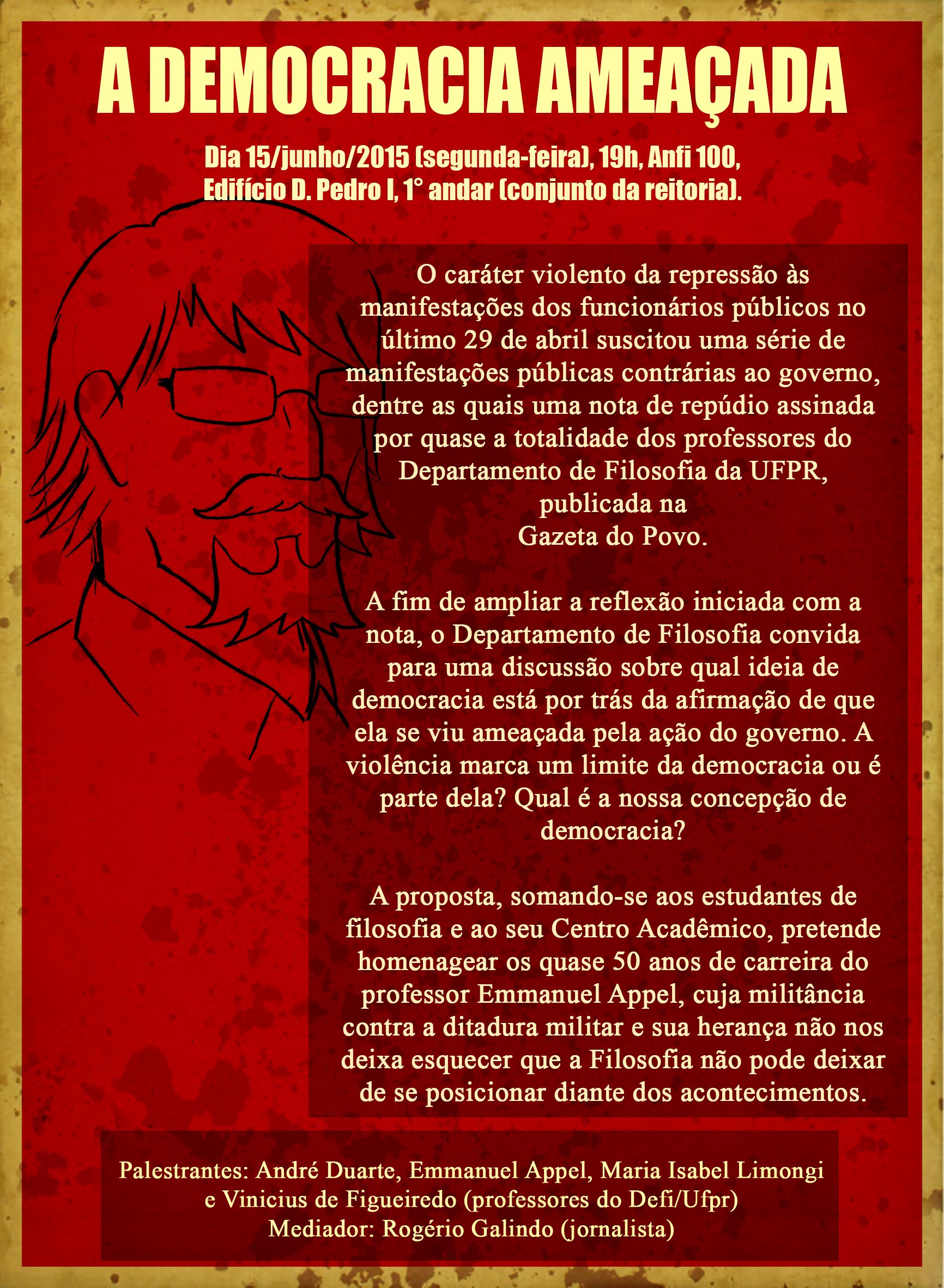 A fim de ampliar a reflexão iniciada com a nota, o Departamento de Filosofia convida para uma discussão sobre qual idéia de democracia está por trás da afirmação de que ela se viu ameaçada pela ação do governo. A violência marca um limite da democracia ou é parte dela? Qual é a nossa concepção de democracia?