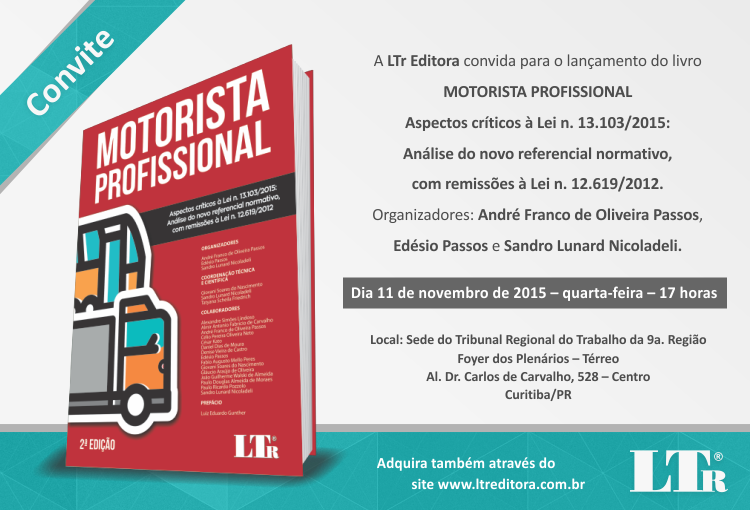 Os advogados André Passos, Edésio Passos e Sandro Lunard convidam para o evento de lançamento da obra “MOTORISTA PROFISSIONAL: aspectos críticos à Lei n. 13.103/2015: análise do novo referencial normativo, com remissões à Lei n. 12.619/2012”. Eles são organizadores da obra que conta com estudos elaborados por ilustres Magistrados, Procuradores do Trabalho, Advogados e Professores, com o apoio institucional da Confederação Nacional dos Trabalhadores em Transportes Terrestres – CNTTT e da Federação dos Trabalhadores Rodoviários do Paraná – FETROPAR.