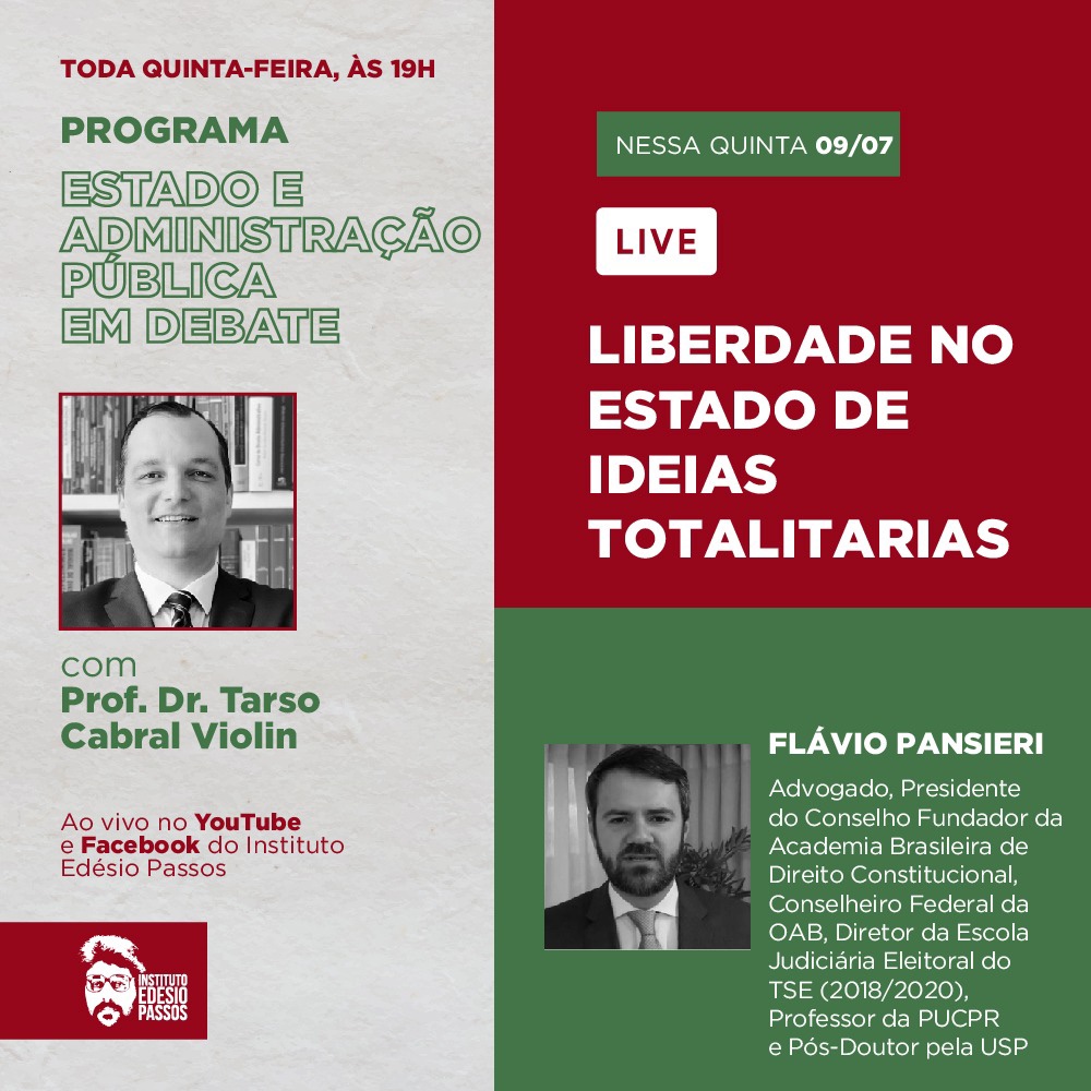 Hoje, dia 09.07, às 19h, o Prof. Dr. Tarso Cabral Violin receberá o jurista Flávio Pansieri, no seu programa “Estado e Administração Pública em Debate”, que será transmitido na página do Facebook e no canal do Youtube do Instituto Edésio Passos, com o tema “Liberdade no Estado de ideias totalitárias”. Pansieri é Advogado, Presidente do Conselho Fundador da Academia Brasileira de Direito Constitucional, Conselheiro Federal da OAB, Diretor da Escola Judiciária Eleitoral do TSE, Professor da PUCPR e Pós-Doutor pela USP. O Professor Tarso é Advogado, Doutor (UFPR), Professor de Direito Administrativo e Sócio-Fundador do Instituto Edésio Passos.