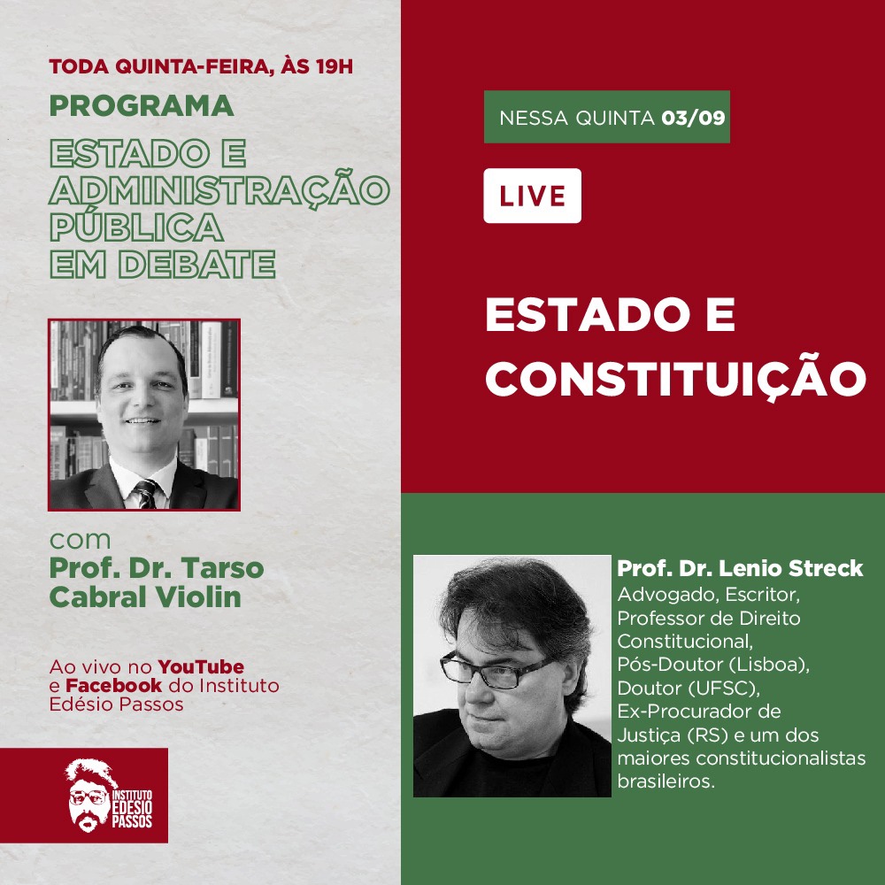 Na quinta-feira, dia 03.09, às 19h, o Prof. Dr. Tarso Cabral Violin receberá o Prof. Dr. Lenio Streck, no seu programa “Estado e Administração Pública em Debate”, que será transmitido na página do Facebook e no canal do Youtube do Instituto Edésio Passos, com o tema Estado e Constituição. Streck é Advogado, Escritor, Professor de Direito Constitucional, Pós-Doutor (Lisboa), Doutor (UFSC), Ex-Procurador de Justiça (RS) e um dos maiores constitucionalistas brasileiros. O Professor Tarso é Advogado, Mestre e Doutor (UFPR), Professor de Direito Administrativo e Sócio-Fundador do Instituto Edésio Passos. Você pode acessar o canal por aqui: http://www.youtube.com/c/InstitutoEdésioPassos Ou pelo Facebook: https://www.facebook.com/InstitutoEdesioPassos/ Esperamos você!