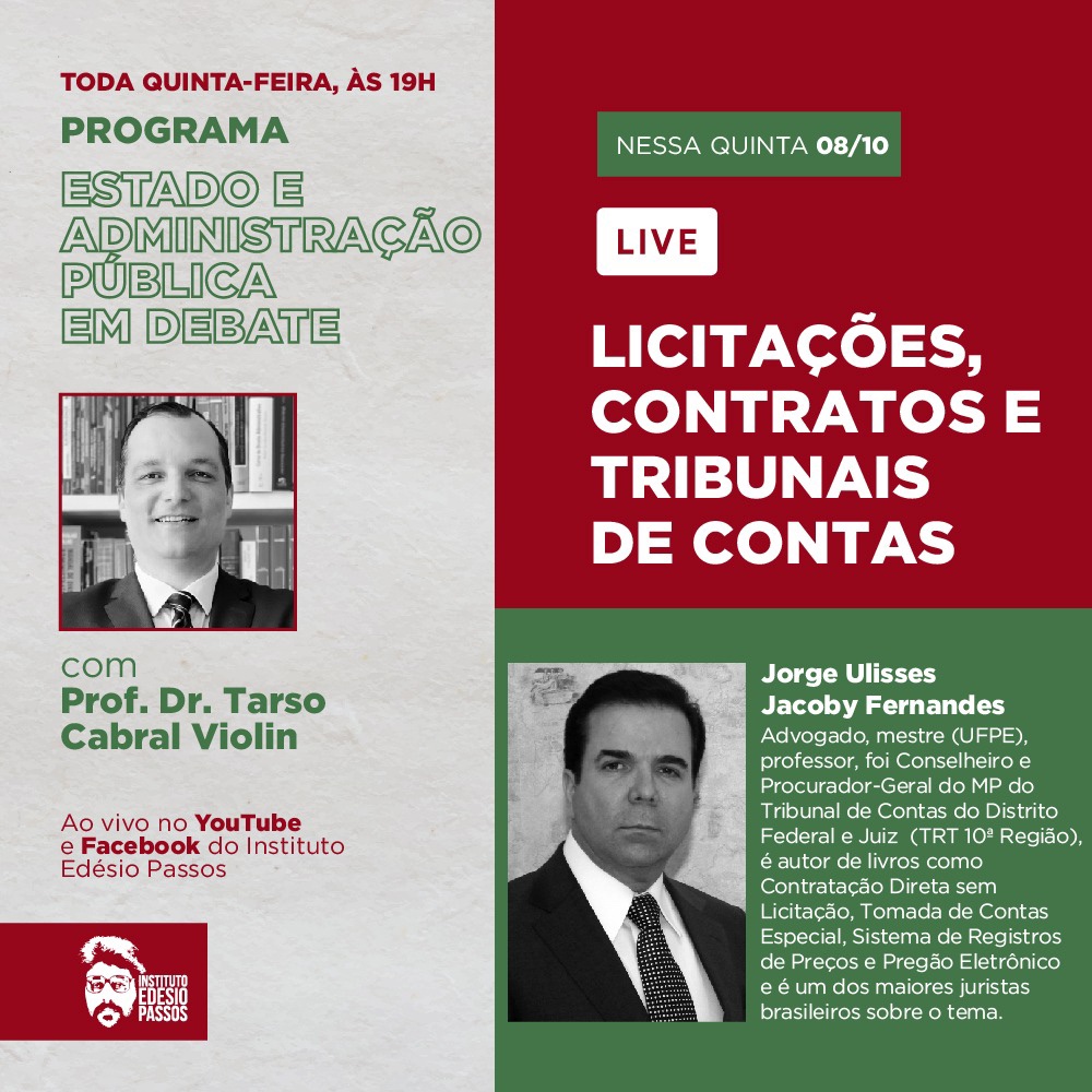 Jorge Ulisses Jacoby Fernandes participará na quinta-feira, 08.10, 19h, do programa “Estado e Administração Pública em Debate”, do Prof. Dr. Tarso Cabral Violin, pela TV do Instituto Edésio Passos (YouTube e Facebook), sobre Licitações, Contratos e Tribunais de Contas. Jacoby é advogado, mestre (UFPE), professor, foi Conselheiro e Procurador-Geral do MP do Tribunal de Contas do Distrito Federal e Juiz (TRT 10ª Região), é autor de livros como Contratação Direta sem Licitação, Tomada de Contas Especial, Sistema de Registros de Preços e Pregão Eletrônico e é um dos maiores juristas brasileiros sobre o tema. Tarso é Advogado, Doutor (UFPR), Vice-Coordenador do Núcleo de Pesquisa em Direito do Terceiro Setor e Políticas Públicas do PPGD-UFPR e Professor de Direito Administrativo. Parceria com CASP-PUCPR, CAHS-UFPR e DACP-UniCuritiba. Solicitamos que marque na sua agenda e siga nossas redes. Links da IEPTV: http://www.youtube.com/c/InstitutoEdésioPassos ou https://www.facebook.com/InstitutoEdesioPassos/