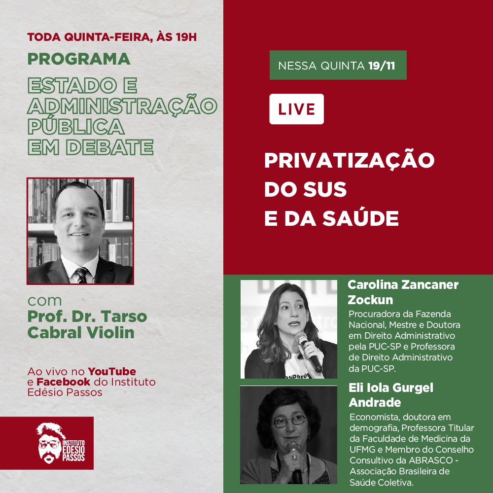Carolina Zancaner Zockun e Eli Iola Gurgel Andrade participarão na quinta-feira, 19.11, 19h, do programa “Estado e Administração Pública em Debate”, do Prof. Dr. Tarso Cabral Violin, pela TV do Instituto Edésio Passos (YouTube e Facebook), sobre Privatização do SUS e da Saúde. A Professora Carolina é Procuradora da Fazenda Nacional, Mestre e Doutora em Direito Administrativo pela PUC-SP e Professora de Direito Administrativo da PUC-SP. A Professora Eli Iola é economista, doutora em demografia, Professora Titular da Faculdade de Medicina da UFMG e Membro do Conselho Consultivo da ABRASCO – Associação Brasileira de Saúde Coletiva. Tarso é Advogado, Doutor (UFPR), Vice-Coordenador do Núcleo de Pesquisa em Direito do Terceiro Setor e Políticas Públicas do PPGD-UFPR, Árbitro da Câmara de Arbitragem e Mediação da Federação das Indústrias do Estado do Paraná e Professor de Direito Administrativo. Parceria com CASP-PUCPR, CAHS-UFPR e DACP-UniCuritiba. Solicitamos que marque na sua agenda e siga nossas redes. Links da IEPTV: http://www.youtube.com/c/InstitutoEdésioPassos ou https://www.facebook.com/InstitutoEdesioPassos/