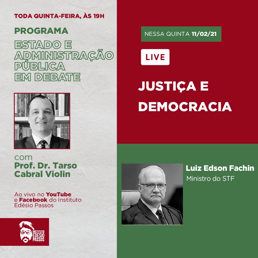 O Ministro do STF Luiz Edson Fachin participará na quinta-feira, 11.02, 19h, do programa “Estado e Administração Pública em Debate”, de Tarso Cabral Violin, pela TV do Instituto Edésio Passos (YouTube e Facebook), sobre Justiça e Democracia. Tarso é Advogado, Mestre e Doutor (UFPR) e Professor de Direito Administrativo. Parceria com CAHS-UFPR, CASP-PUCPR e DACP-UniCuritiba. Solicitamos que marque na sua agenda e siga nossas redes. Links da IEPTV: http://www.youtube.com/c/InstitutoEdésioPassos ou https://www.facebook.com/InstitutoEdesioPassos/