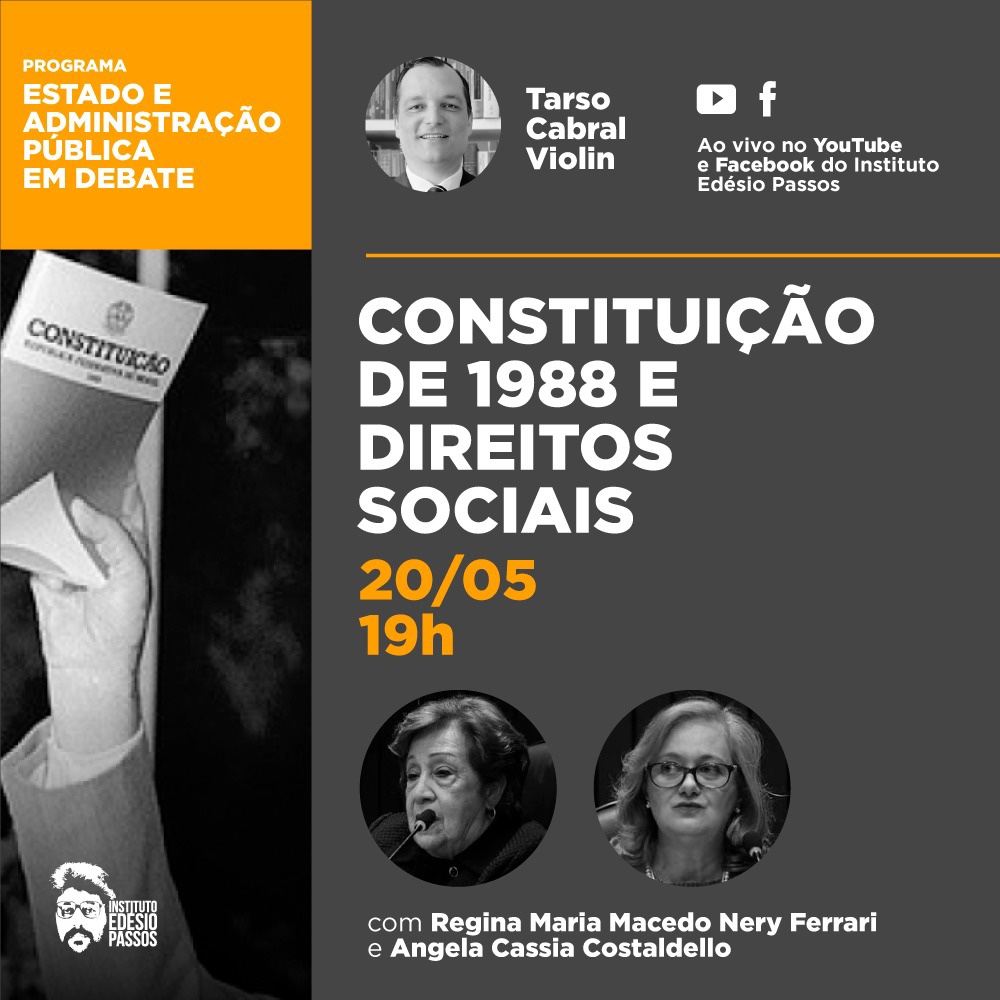 As juristas Regina Maria Macedo Nery Ferrari e Angela Cassia Costaldello participarão na quinta-feira, 20.05.2021, 19h, do programa “Estado e Administração Pública em Debate”, de Tarso Cabral Violin, pela TV do Instituto Edésio Passos (YouTube e Facebook), sobre Constituição de 1988 e Direitos Sociais. A Professora Regina é Advogada, Escritora, Doutora em Direito do Estado pela UFPR, Professora de Direito Constitutional da UFPR e Coordenadora-Geral do Instituto de Direito Romeu Bacellar. A Professora Angela é advogada, ex-procuradora do MP junto ao TCE-PR, Professora de Direito Público da UFPR, Doutora em Direito do Estado pela UFPR e pesquisadora visitante da Universidade de Palermo. Tarso é Advogado, Mestre e Doutor (UFPR) e Professor de Direito Administrativo. Links da IEPTV: http://www.youtube.com/c/InstitutoEdésioPassos ou https://www.facebook.com/InstitutoEdesioPassos/