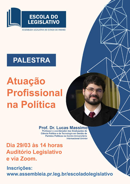 A Escola do Legislativo realizará a palestra Atuação Profissional na Política, a ser realizada no dia 29 de março de 2023, às 14 horas, em formato híbrido (presencialmente, no Auditório Legislativo da Assembleia Legislativa do Paraná, e virtualmente, via Zoom), de forma gratuita.