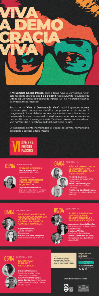 O Instituto Edésio Passos, presidido pelo advogado André Passos, realizará entre os dias 3 e 5 de abril de 2023 a VI Semana Edésio Passos, na Faculdade de Direito da UFPR, que fica em seu Prédio Histórico na Praça Santos Andrade. O evento é aberto e gratuito.