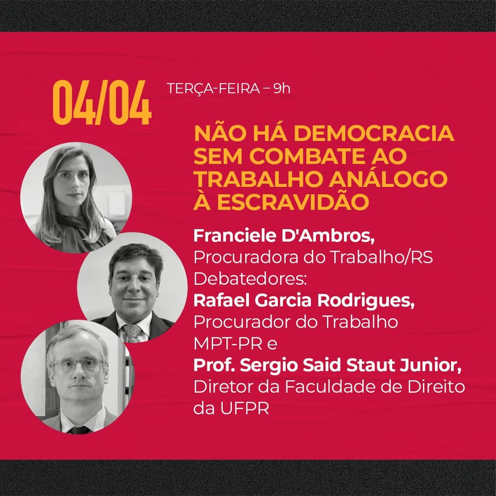 Dia 4 (terça), 9h, ocorrerá a mesa “Não há Democracia sem combate ao trabalho análogo à escravidão”, com os Procuradores do Trabalho do MPT Franciele D`Ambros (RS) e Rafael Garcia Rodrigues (PR), e com o Diretor da Faculdade de Direito da UFPR, Sergio Said Staut Junior.