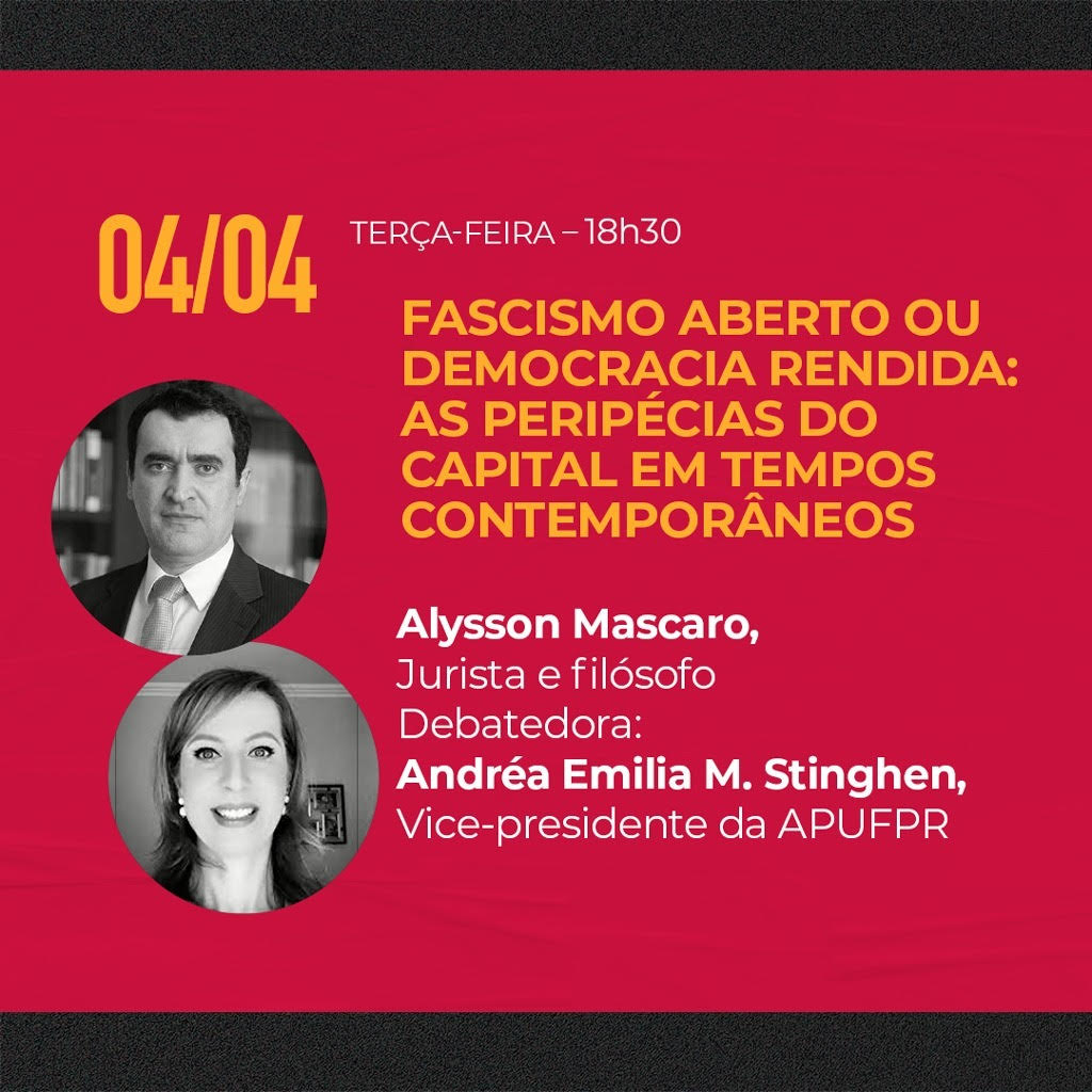 Às 18h30 ocorrerá a palestra sobre “Fascismo aberto ou democracia rendida: as peripécias do capital em tempos contemporâneos”, com o jurista e filósofo Alysson Mascaro e como debatedora a vice-presidente da APUFPR, Andréa Emilia M. Stinghen.