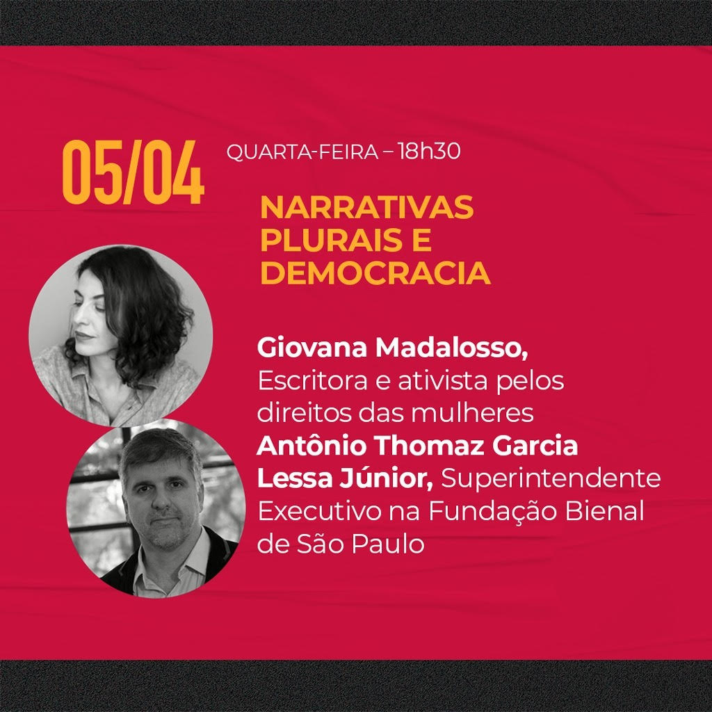 E, por fim, 18h30, sob a presidência do advogado, professor e associado-fundador do IEP, Tarso Cabral Violin, a mesa “Narrativas plurais e Democracia”, com Giovana Madalosso, escritora e ativista pelos direitos das mulheres, e Antônio Thomaz Garcia Lessa Júnior, Superintendente Executivo na Fundação Bienal de São Paulo.