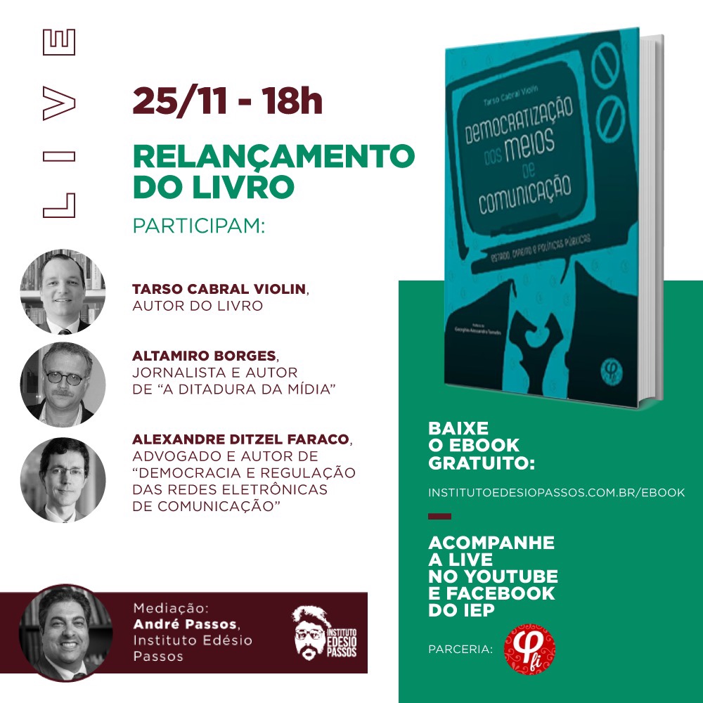 Dia 25.11, 18h, ocorrerá o relançamento do livro “Democratização dos Meios de Comunicação: Estado, Direito e Políticas Públicas” de Tarso Cabral Violin com bate-papo com Altamiro Borges (Jornalista, Escritor, Presidente do Centro de Estudos da Mídia Alternativa Barão de Itararé e autor do livro A Ditadura da Mídia) e Alexandre Ditzel Faraco (Advogado, Doutor em Direito pela USP, Professor de Direito da Concorrência e Econômico na UFPR e autor do livro Democracia e Regulação das Redes Eletrônicas de Comunicação: Rádio, Televisão e Internet), com mediação de André Passos (advogado e presidente do IEP) pelo Instituto Edésio Passos, em parceria com a Editora Fi. Pela TV do Instituto Edésio Passos (YouTube e Facebook). Solicitamos que marque na sua agenda e siga nossas redes. Links da IEPTV: http://www.youtube.com/c/InstitutoEdésioPassos ou https://www.facebook.com/InstitutoEdesioPassos/