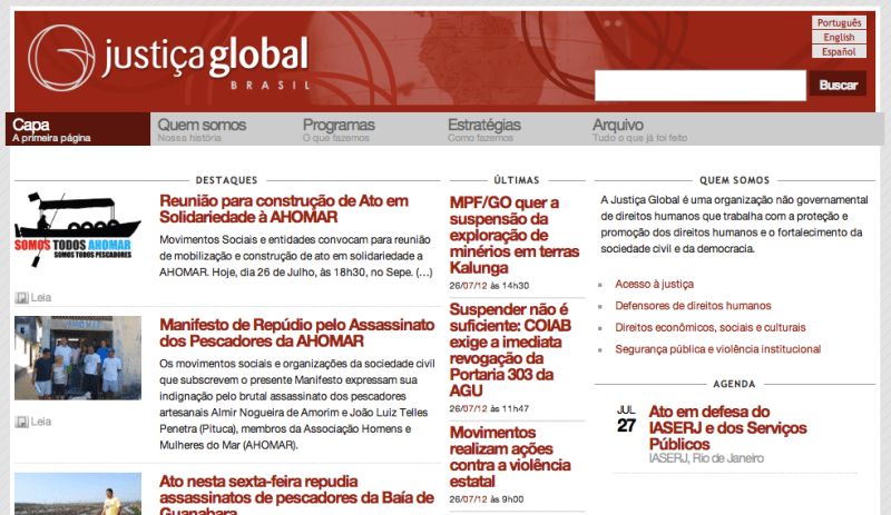A Justiça Global foi fundada em 1999 para fortalecer a sociedade civil brasileira e democracia, melhorar o acesso à justiça e tem laços estreitos com grupos de base e uma reputação para a publicação de relatórios contundentes sobre as violações que levaram reformas em áreas essenciais, como a violência policial, os esquadrões da morte, a criminalização dos movimentos sociais, os abusos da prisão, a reforma agrária e as violações dos direitos humanos causados por grandes projetos de infra-estrutura.