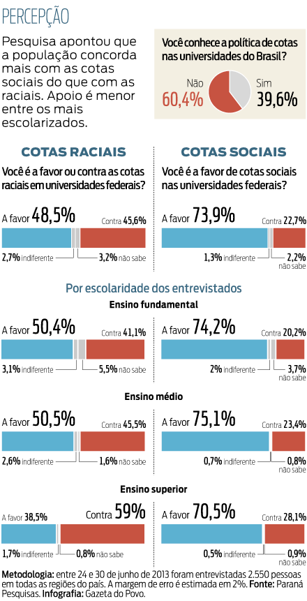 Se a coisa está tão ruim, que tal propormos uma coisa: troque de lugar com algum aluno de escola pública. Já que não é possível trocar a cor da sua pele, pague, pelo menos, a mensalidade para que ele estude na sua escola e se mude para a dele. Ou, seja a cobaia da sua própria teoria. Já que você acredita que a única ação que deveria ser proposta é melhorar a educação básica: peça para o seu pai investir o dinheiro dele em alguma escola, entre nela gratuitamente junto com alguns outros alunos, estude nela durante 12 anos e então volte a tentar o vestibular. Ah, você não pode esperar tanto tempo? Então, porque os negros e pobres podem esperar até mais, já que todos sabemos que o problema da má qualidade da educação básica no Brasil não é algo que pode ser resolvido de ontem pra hoje?