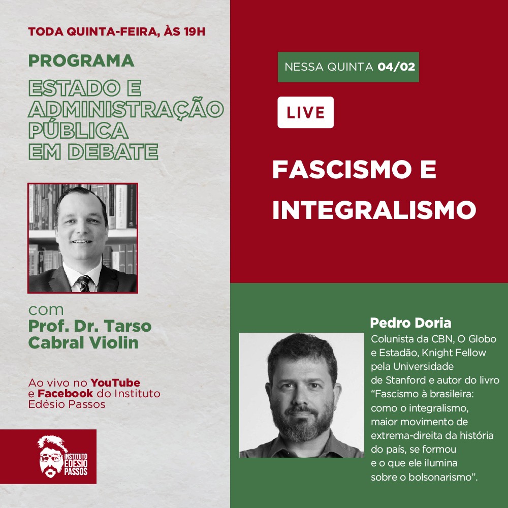 Pedro Doria participará na quinta-feira, 04.02, 19h, do primeiro programa do ano “Estado e Administração Pública em Debate”, de Tarso Cabral Violin, pela TV do Instituto Edésio Passos (YouTube e Facebook), sobre Fascismo e Integralismo. Doria é colunista da CBN, O Globo e Estadão, Knight Fellow pela Universidade de Stanford e autor do livro “Fascismo à brasileira: como o integralismo, maior movimento de extrema-direita da história do país, se formou e o que ele ilumina sobre o bolsonarismo”. Tarso é Advogado, Mestre e Doutor (UFPR) e Professor de Direito Administrativo. Parceria com CAHS-UFPR, CASP-PUCPR e DACP-UniCuritiba. Solicitamos que marque na sua agenda e siga nossas redes. Links da IEPTV: http://www.youtube.com/c/InstitutoEdésioPassos ou https://www.facebook.com/InstitutoEdesioPassos/