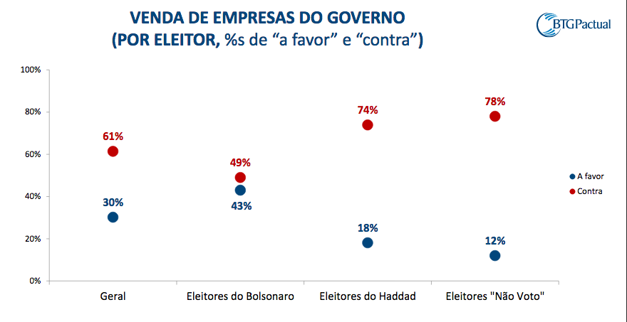 Em pesquisa BTG divulgada hoje (22.10.2018), 61% dos brasileiros são contrários às privatizações das empresas estatais.
