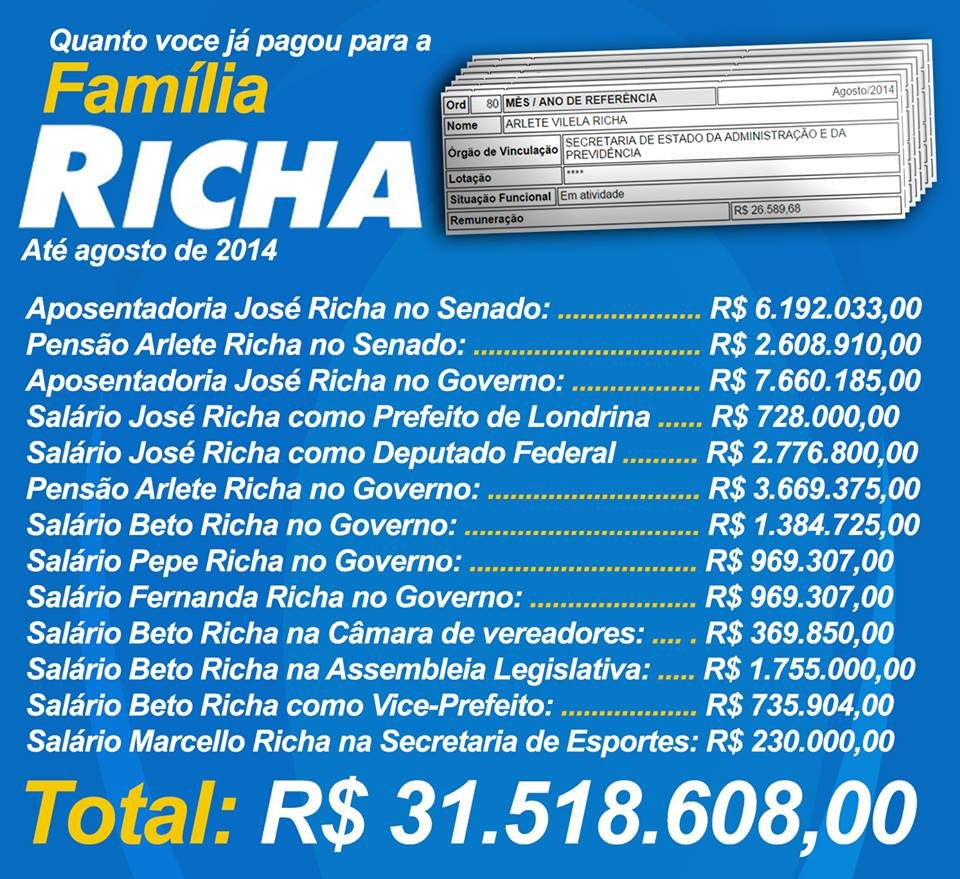 A família Richa já custou aos cofres públicos municipais, estadual e federal mais de R$ 31,5 milhões até o último mês de agosto. Dentre os quatro integrantes do clã paranaense que atualmente recebem rendimentos do erário, Arlete Richa lidera a lista de ganhos, com pensões que somam os R$ 43.101,77 mensais. Em seguida vem o filho, Beto Richa, com salário de governador de R$ 29.462,25 por mês. O irmão do governador, o secretário de Infraestrutura e Logística, Pepe Richa e a primeira-dama Fernanda Richa, recebem cada um R$ 20.623,57 por mês, com direito a 13º salário, sem contar os benefícios do cargo.